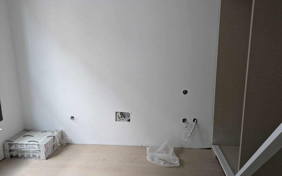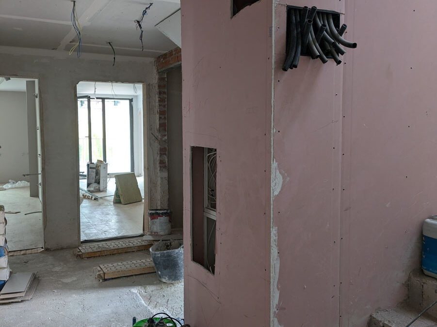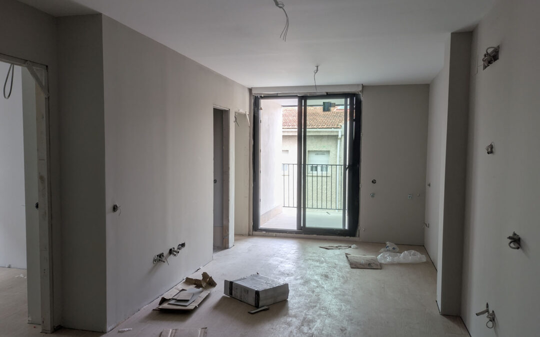 El proyecto Residencial Algemesí 29 se encuentra en el momento de máxima producción: mientras se finaliza con la ejecución de las instalaciones del edificio, se están colocando los solados y acabados previamente seleccionados por los clientes en las viviendas.